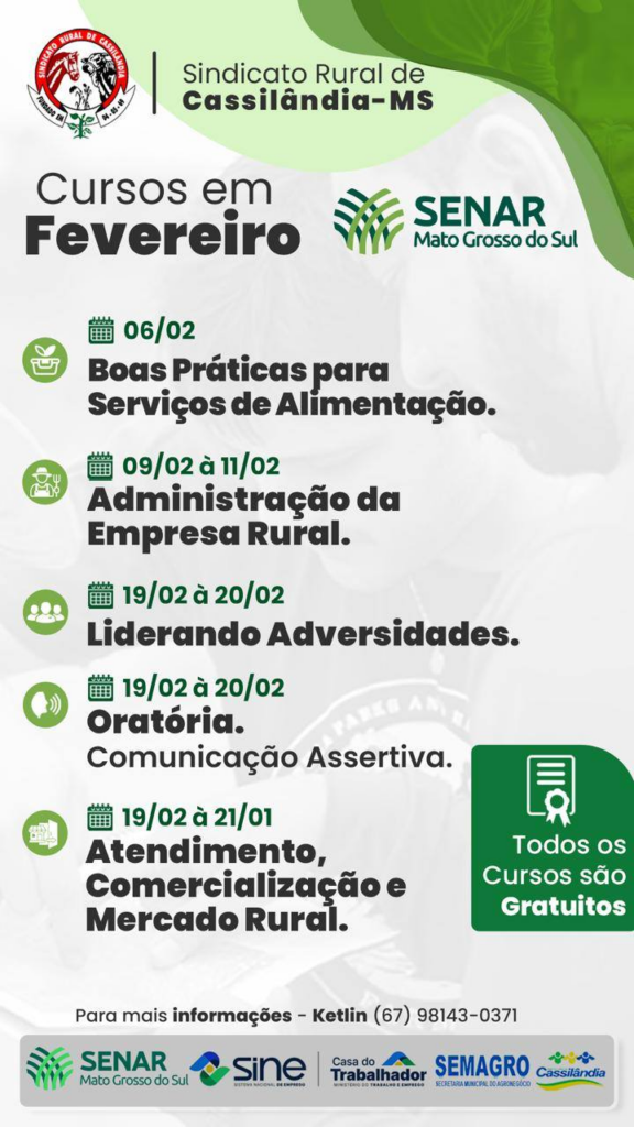 O Sindicato Rural de Cassilândia-MS, em parceria com o Serviço Nacional de Aprendizagem Rural (SENAR-MS), com o apoio da Prefeitura Municipal de Cassilândia e da Secretaria Municipal de Agronegócio, está promovendo uma série de cursos gratuitos ao longo do mês de fevereiro, voltados à capacitação profissional e ao fortalecimento do setor rural e de serviços do município.