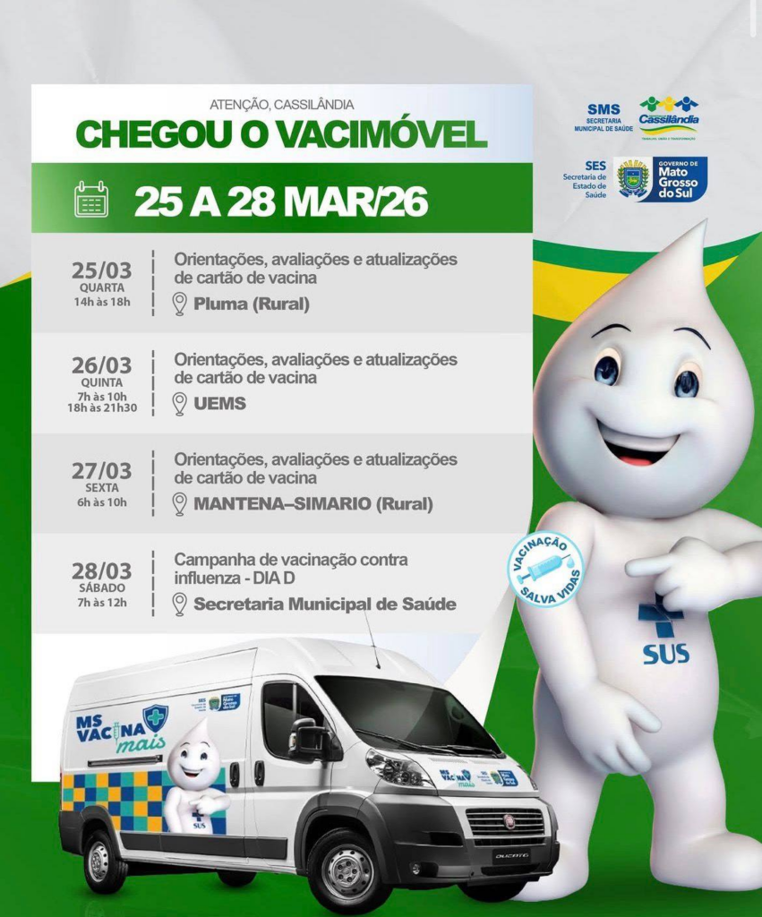 A população de Cassilândia contará, entre os dias 25 e 28 de março, com a presença do Vacimóvel, uma unidade itinerante que levará serviços de orientação, avaliação e atualização do cartão de vacina a diferentes pontos do município, incluindo áreas urbanas e rurais.